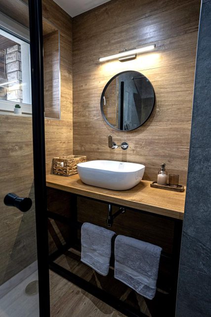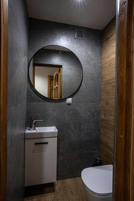 Łazienka: prysznic, toaleta, umywalka, lustro, grzejnik łazienkowy, suszarka,