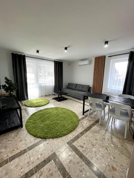 Salon: duży stół, 4 krzesła, TV , rozkładana sofa dla 2 osób, Całość dopełniają elementy dekoracyjne, wyjście na taras.